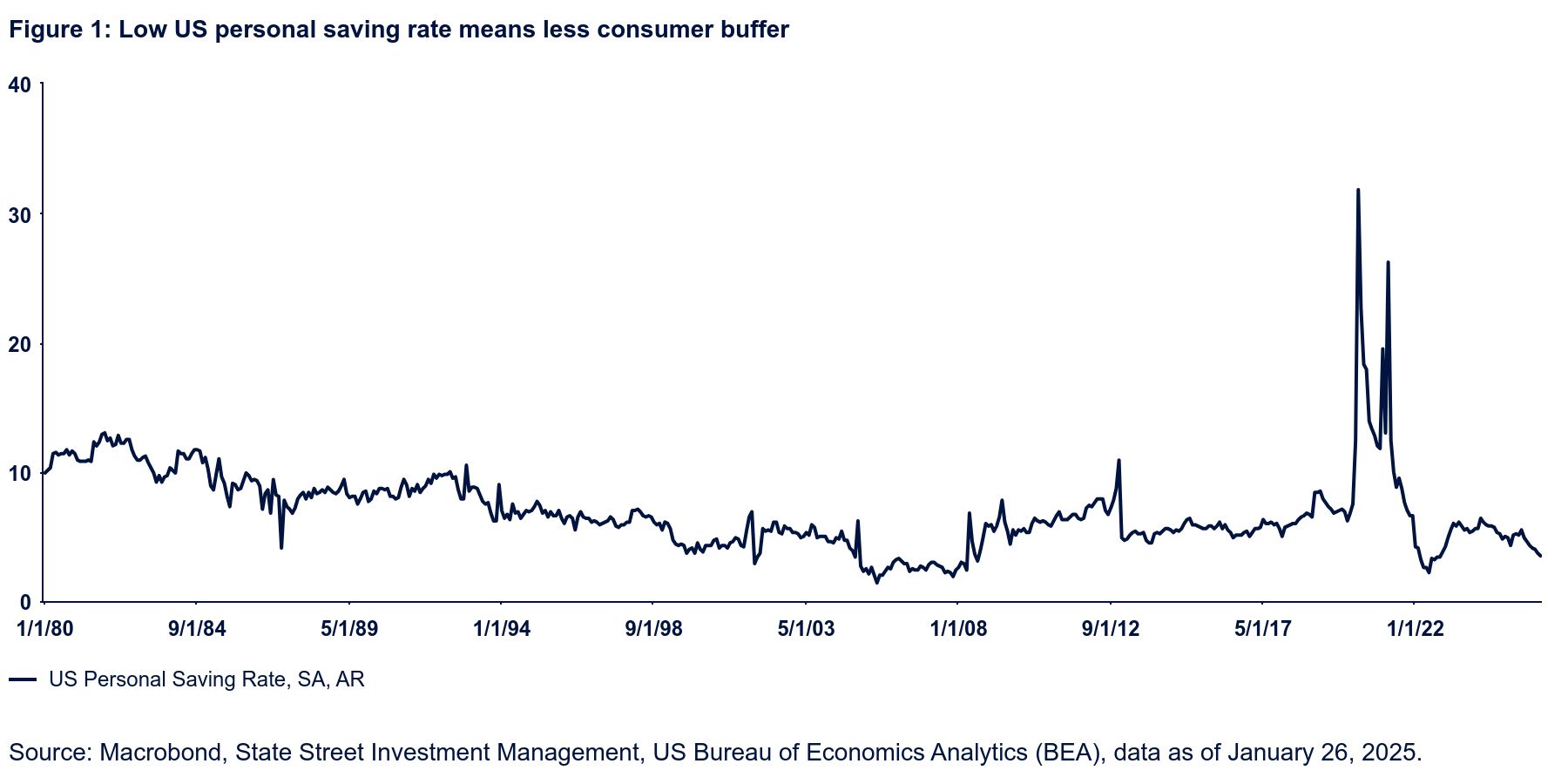 Nobody can tell how much of this reflects the effects of AI‑related labor displacement. However, we can be pretty sure that those effects will intensify, rather than dissipate, over the coming year. As such, a low savings rate highlights a potential consumer vulnerability insofar as a job loss in an environment of reduced savings could require more substantial consumption cutbacks.