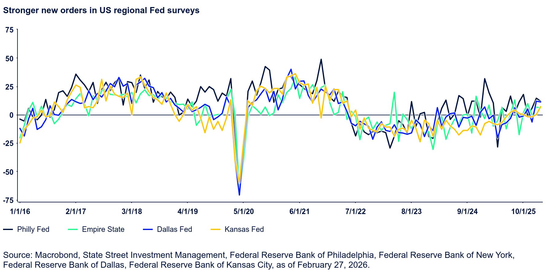 To these, we can perhaps add another: a gradual yet unmistakable revival in industrial activity. After an extensive period of weakness spanning 2023–2024, US industrial production returned to positive YoY growth in January 2025. However, those gains did not cross above 1.0% YoY until last July. Since then, there has been a slight further uptrend, with output up 2.3% YoY in January 2026, the best print since September 2022.