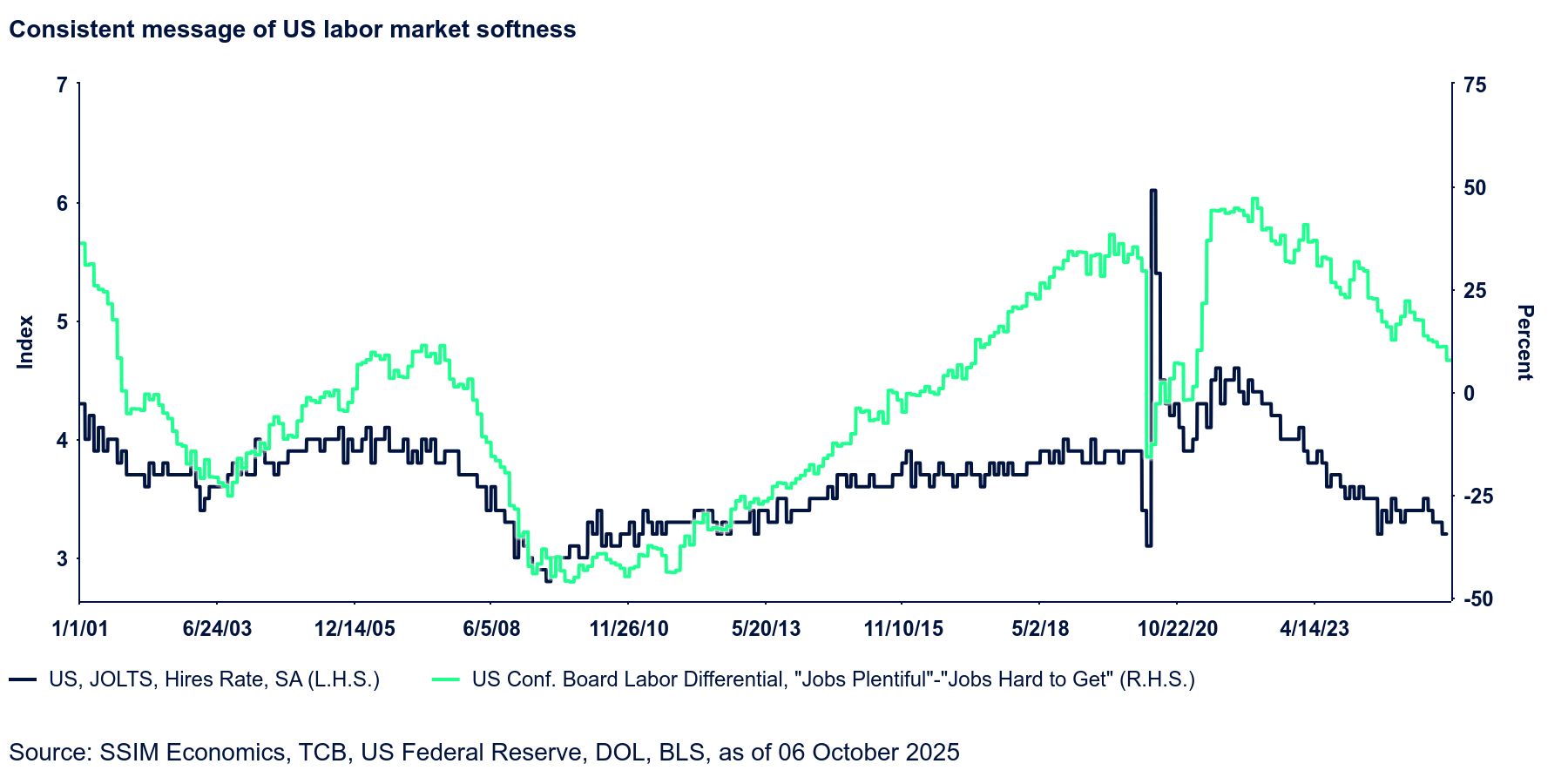 We have been arguing for quite a while that the US labor market is not nearly as robust as the unemployment rate makes it appear. The release of the premier employment report has been delayed due to the government shutdown that began on October 1, but other reliable signals offer a consistent message of labor market softness. The Conference Board labor differential slipped 3.3 points to 7.8, the second-largest monthly decline this year and the lowest level since February 2021. Meanwhile, the hire rate in the JOLTS report dipped to 3.2%, only a hairbreadth above the Covid low and otherwise the lowest since 2012. The “slow hire” risks turning into a “no hire” narrative if this persists.