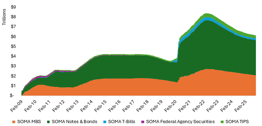 Balance sheet policy also took center stage, with Powell announcing the end of Quantitative Tightening (QT) on December 1. The Fed’s balance sheet is now roughly $2.2 trillion smaller than its peak, and now stands at $6.1 trillion. The Fed will stop letting US Treasuries roll off and now allow the MBS that pays down to be reinvested into US T-Bills, shifting the SOMA portfolio toward a more traditional composition. This pivot is designed to stabilize reserve levels and reduce funding stress, which had begun to surface in recent weeks. Powell emphasized that these changes were anticipated and align with long-term goals, but the timing underscores the Fed’s desire to maintain liquidity as uncertainty lingers. Think of it as the Fed swapping out its old workout routine for something less strenuous—still healthy, just less intense.